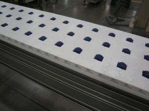 A great solution for places where accumulation is necessary is a conveyor with a roller top belt. The roller belt is similar to a regular plastic belt but it has small rollers placed throughout the belt allowing product to accumulate as it moves down the line. This type of belt is a great option for low back pressure accumulation and side transfer applications because it allows products to keep moving while they gently accumulating. With product accumulating much more gently they are less likely to be damaged by colliding with other products or the belt scuffing the bottom or sides of the packages. It also is a nice choice because it is a low friction belt it reduces the load pressure and wear on the belt as well as other conveyor parts. This means that you can anticipate longer belt life and less wear on bearings and other components.