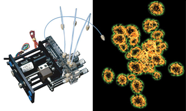 The manufacturer of a device to analyze air contaminants needed a fluid transfer system to dispense samples in a liquid carrier onto an identification card. Their combination of tubing, valves and pumps from different suppliers was too large for the instrument and too imprecise to control the sub-micro liter fluid volumes required.