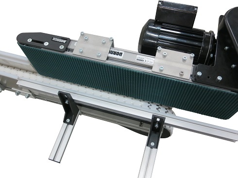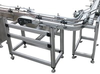 The solutions devised by Dorner's Engineered Solutions Group was to use a 2200 Series SmartFlex conveyor with FlexMove Technology as the mainline units and a powered side guide at the transfer points. The guide uses a Dorner 2200 Series Belted conveyor with a high friction belt. The high friction belt on the 2200 Series helps to grip the bottle and prevent it from tipping while it transfers from one conveyor to the next.