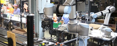 Employees at Scott Fetzer Electrical Group in Nashville, Tennessee, named a UR5 and a UR10 robot working in tandem “Thelma & Louise”. “We were afraid they were going off a cliff, but they ended up saving us,” says Line Lead, Sebrina Thompson, reflecting on the repetitive and ergonomically unfavorable tasks now taken over by the collaborative UR robots.